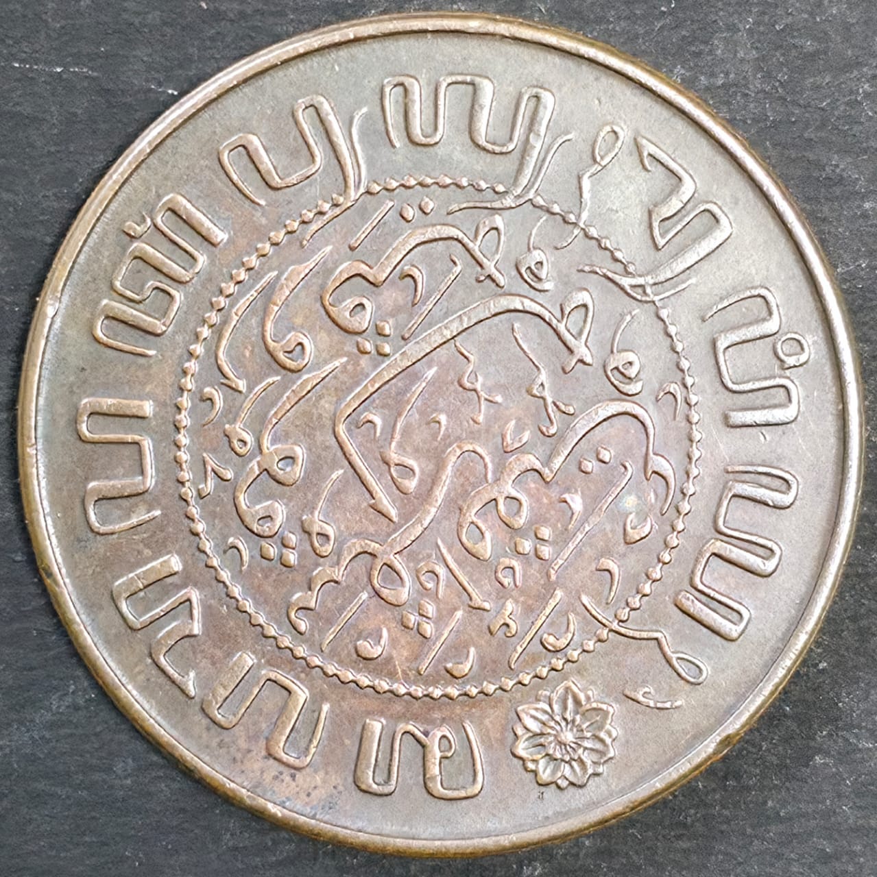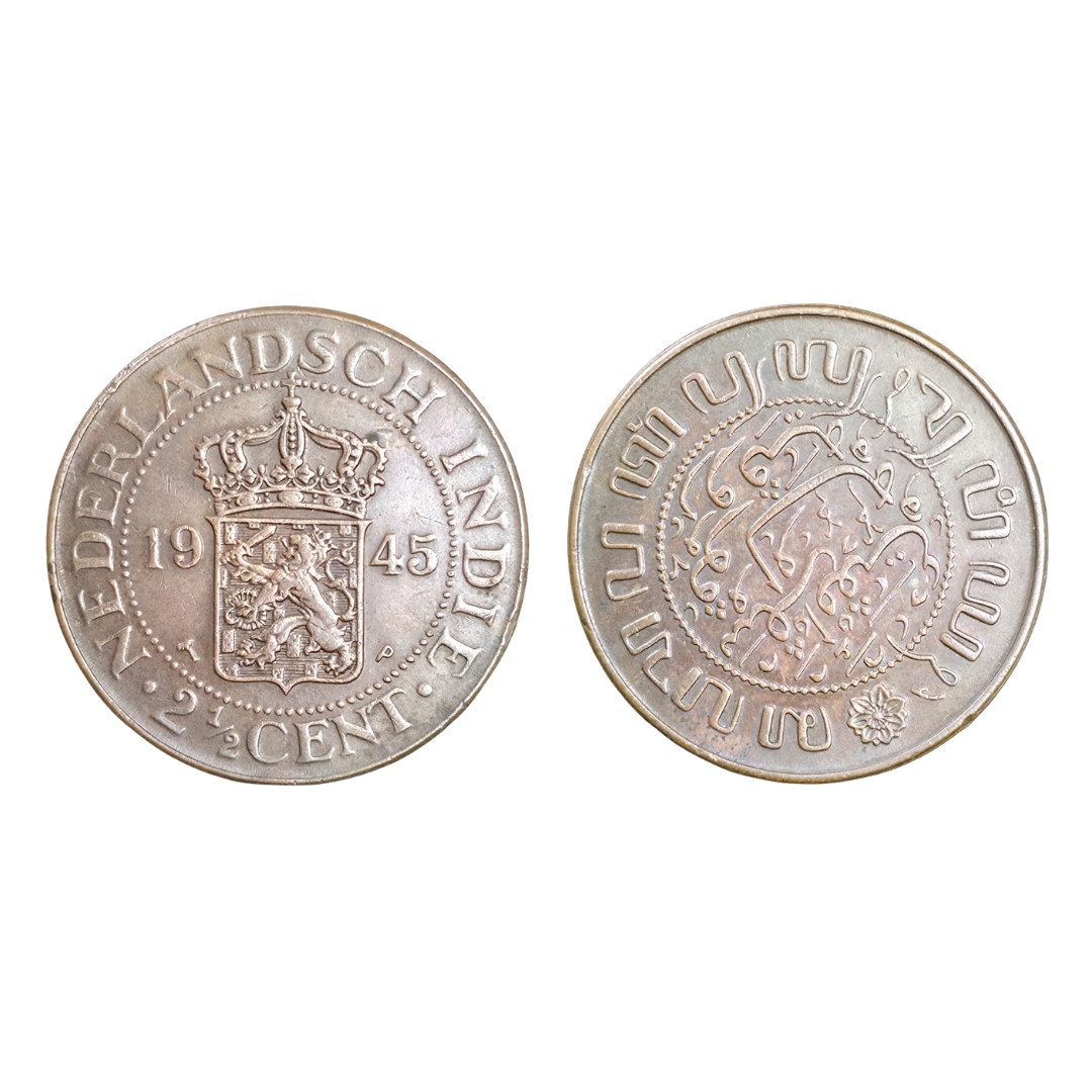 This 1945 Netherlands East Indies 2½ Cents coin was issued under the reign of Queen Wilhelmina, the longest-reigning Dutch monarch. Struck in bronze with a smooth edge, this coin reflects the colonial-era currency used in the Dutch East Indies (modern-day Indonesia) during the final years of World War II.