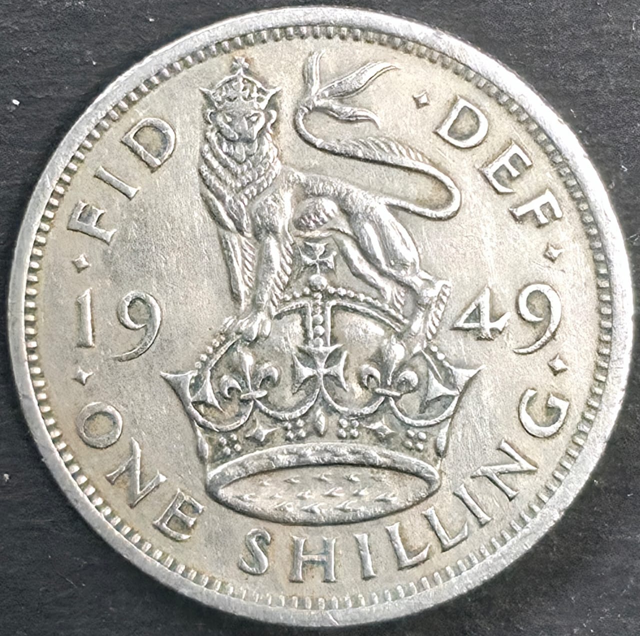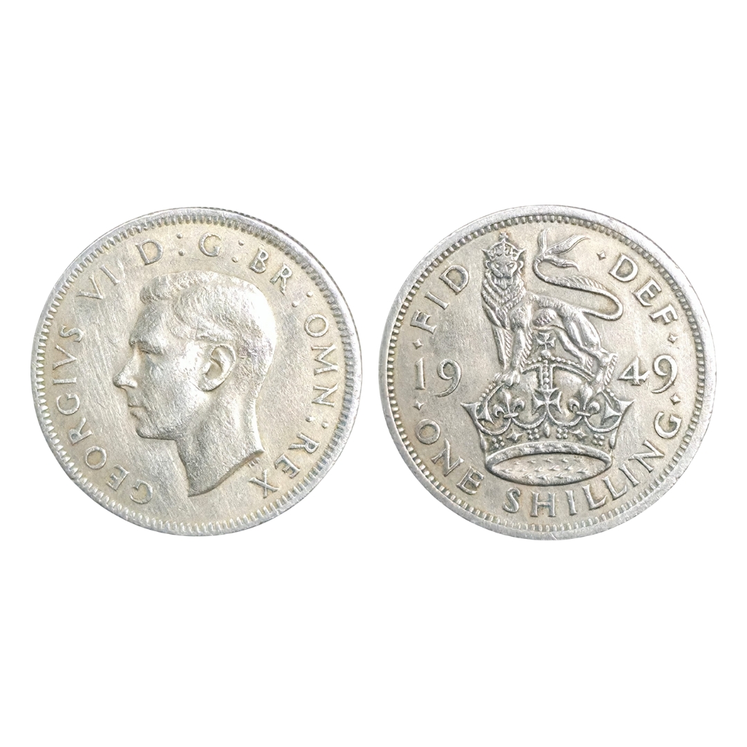 This 1949 One Shilling coin from the reign of King George VI (1936–1952) is a classic piece of post-war British coinage. Struck in Copper-Nickel (CuNi), it replaced the earlier silver issues, marking a new era in UK minting.