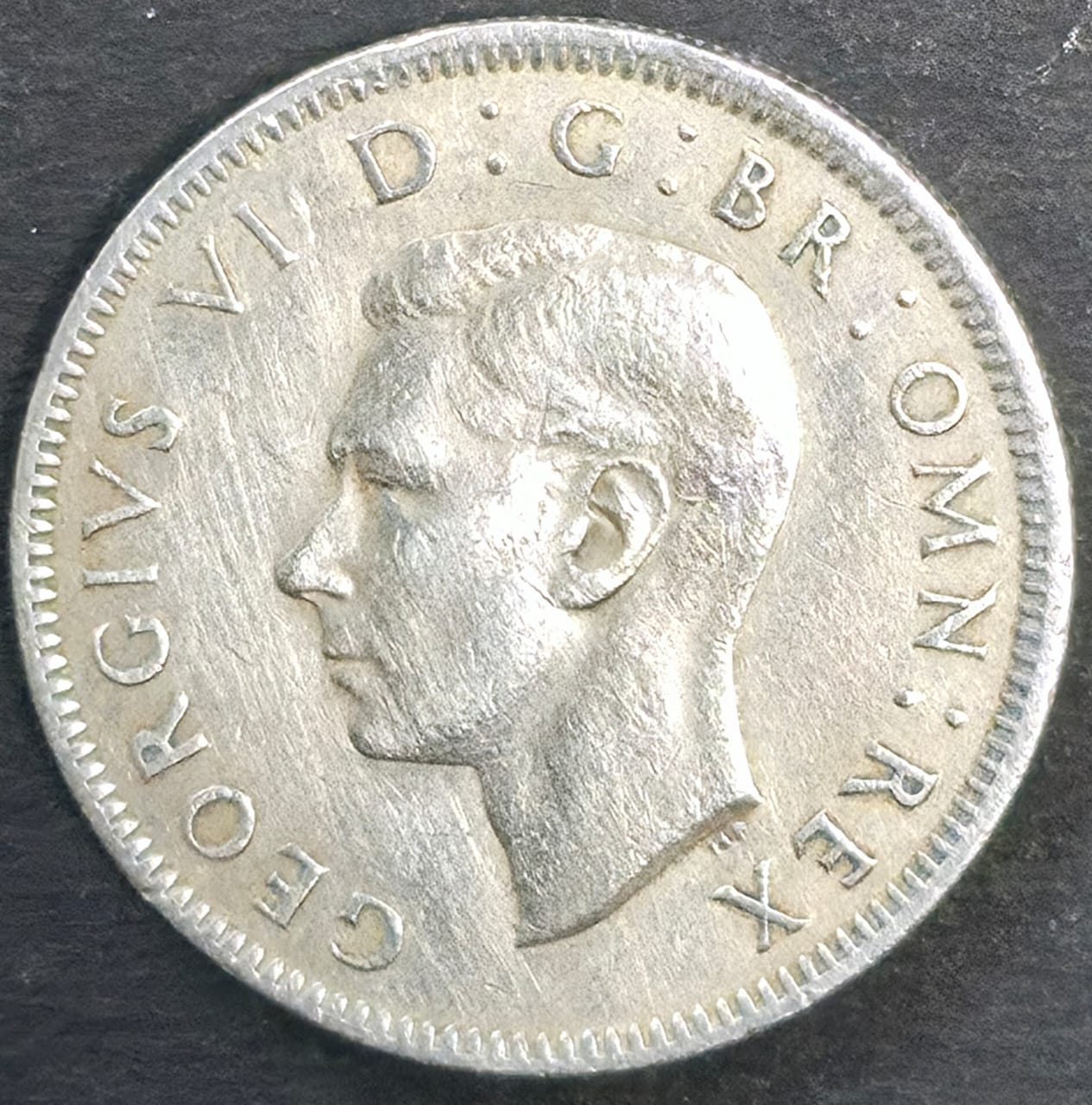 The obverse features the crowned effigy of King George VI, while the reverse depicts the crowned lion standing atop the royal crown, holding a sword and sceptre — an enduring symbol of British sovereignty.