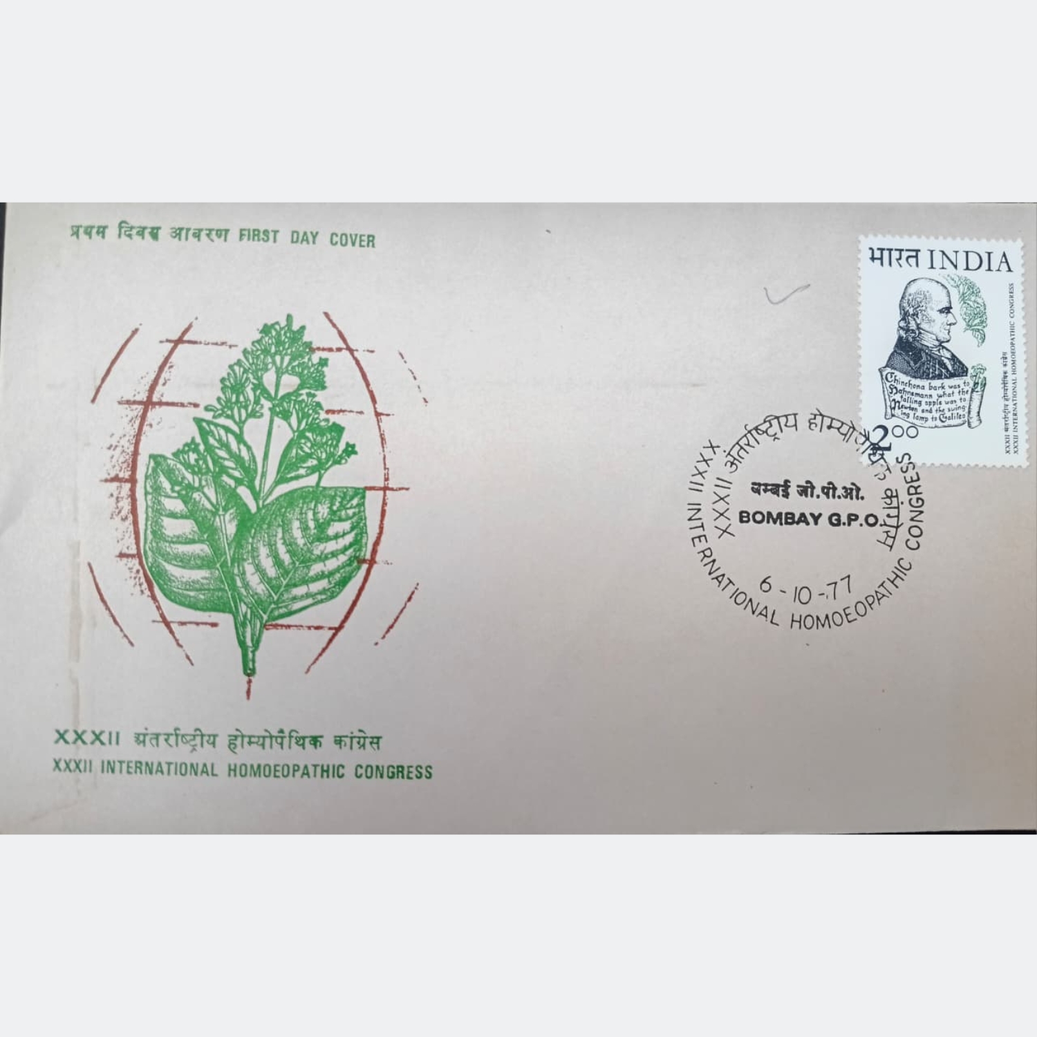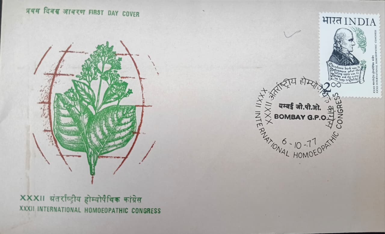 This First Day Cover (FDC), issued in 1977, commemorates Samuel Hahnemann (1755–1843), the founder of homeopathy. His groundbreaking observation that Cinchona bark could produce malaria-like symptoms in healthy individuals became the cornerstone of his medical philosophy—just as the falling apple was to Newton and the swinging lamp to Galileo.