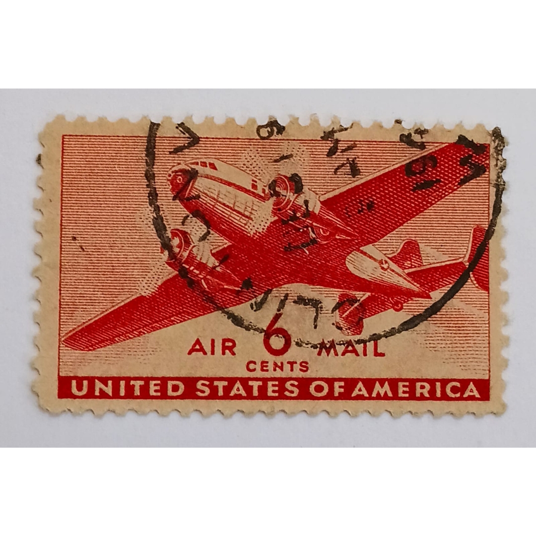 This authentic USA Air Mail postage stamp from the 1940s features the iconic DC-4 Skymaster aircraft, symbolizing the golden age of American aviation and international air mail service. Printed in striking red, the stamp carries a $25 face value and bears an uncomplicated (light) cancellation, making it desirable for collectors who appreciate clarity of design and historical significance.