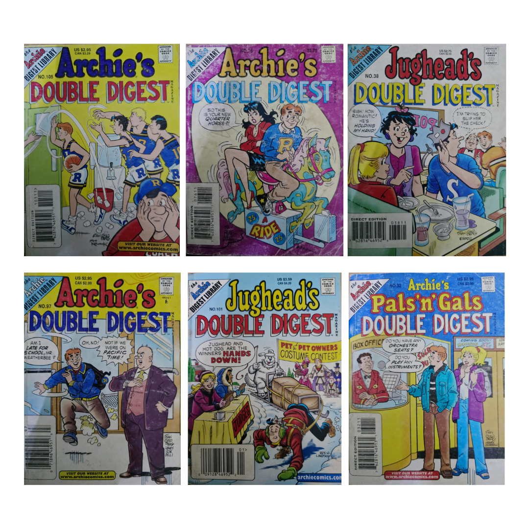 A collectible set of six vintage Archie’s Double Digest comics, featuring the iconic adventures of Archie, Jughead, Betty, Veronica, and friends from Riverdale. These timeless stories bring back the charm and humor that made Archie Comics a household favorite.
