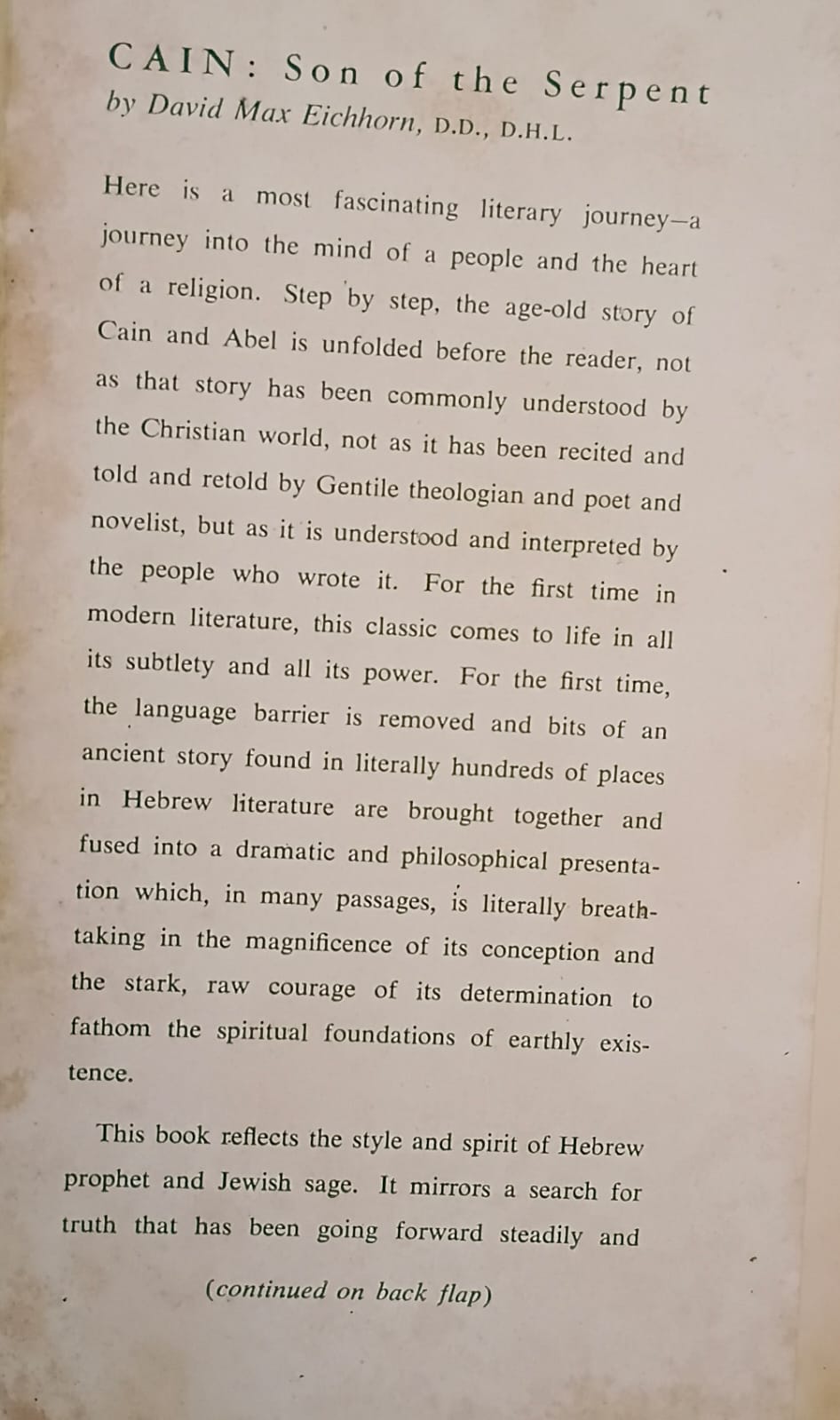 Cain: Son of the Serpent – A Midrash by David Max Eichhorn (1957, Vintage Hardcover) – $9